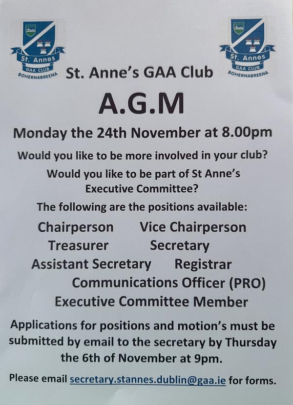 Nomination and motion forms can be requested from secretary.stannes.dublin@gaa.ie or by download from the St Anne's website.